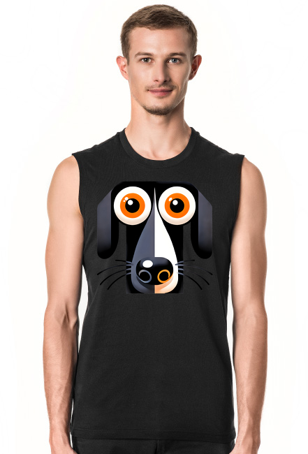 Koszulka Męska bez Rękawków - Czarno-Szary Pies Ilustracja z Dużymi Pomarańczowymi Oczami - Unikalna Grafika Dla Miłośników Zwierząt SKU: koszulka-bez-r-kaw-w-m-ska_la00scz7_4779425