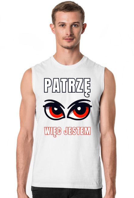 Koszulka męska bez rękawków z wyjątkową grafiką "Oko Mocy - Wizualna Ekspresja Bytu" to doskonały wybór dla każdego, kto ceni sobie oryginalność i artystyczny wyraz. Ta koszulka łączy w sobie elementy oczu, napisu, oraz unikalną wizualizację, tworząc inspirujący plakat do noszenia na co dzień. Grafika przedstawia intensywne oczy, które symbolizują siłę i determinację, a napis "Patrzę Więc Jestem" dodaje głębi i motywacji.