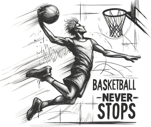 Męska koszulka z długim rękawem, ozdobiona dynamiczną grafiką koszykarza w locie, z inspirującym hasłem "Basketball Never Stops". Ta sportowa grafika idealnie oddaje energię i pasję do koszykówki, stanowiąc inspirację sportową dla każdego miłośnika tego sportu. Grafika jest wysokiej rozdzielczości, co zapewnia, że każdy szczegół, od piłki po szkic koszykarza, jest wyraźny i imponujący.