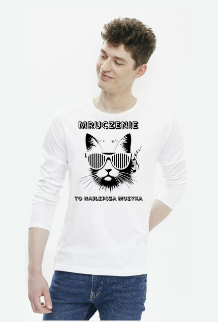 Męska Koszulka z Długim Rękawem - Symfonia kociego mruczenia - medytacja dla kociarzy to wyjątkowa koszulka, która łączy w sobie miłość do kotów i sztukę relaksu. Grafika przedstawia czarnego kota w kocich okularach, otoczonego nutami, którego mruczenie przypomina relaks z kotem. Jest to idealna propozycja dla wszystkich kociarzy, którzy cenią sobie przyjaciela kota i wyjątkowe grafiki.