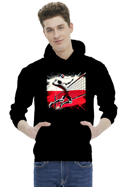 Polski siatkarz w dynamicznym skoku nad siatką na tle stylizowanej flagi Polski – pop-art grafika w intensywnych odcieniach czerwieni, czerni i bieli – Bluza Męska z Kapturem SKU: Bluza-z-kapturem_o0zoc0p9_4776519
