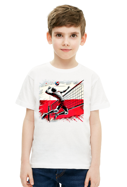 Przedstawiam koszulkę dziecięcą unisex z unikalną grafiką przedstawiającą polskiego siatkarza w dynamicznym skoku nad siatką, na tle stylizowanej flagi Polski. Grafika w stylu pop-art jest utrzymana w intensywnych odcieniach czerwieni, czerni i bieli, co nadaje jej niezwykłego charakteru i energii. Sportowa grafika łączy elementy graffiti z vintage efektem, tworząc wyjątkowy i dynamiczny design.
