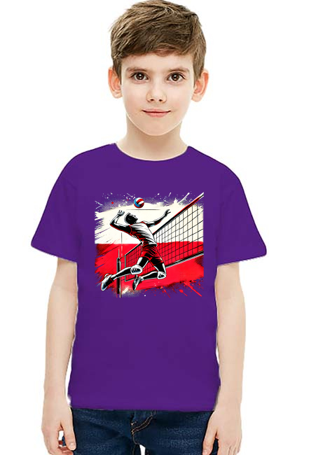 Polski siatkarz w dynamicznym skoku nad siatką na tle stylizowanej flagi Polski – pop-art grafika w intensywnych odcieniach czerwieni, czerni i bieli – Koszulka Dziecięca Unisex SKU: koszulka-chlopiec-new_nslpl0k0_4776482