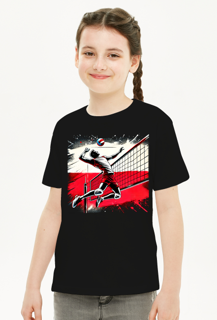 Przedstawiam koszulkę dziewczęcą z unikalną grafiką, która z pewnością przyciągnie uwagę. Na koszulce znajduje się polski siatkarz w dynamicznym skoku nad siatką, na tle stylizowanej flagi Polski. Grafika w stylu pop-art w intensywnych odcieniach czerwieni, czerni i bieli dodaje energii i wyjątkowego charakteru. Sportowa grafika, łącząca elementy graffiti i vintage, tworzy niezapomniany design.