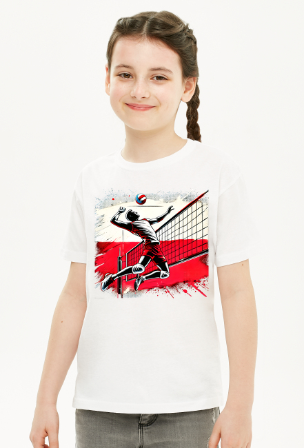 Przedstawiam koszulkę dziewczęcą z unikalną grafiką, która z pewnością przyciągnie uwagę. Na koszulce znajduje się polski siatkarz w dynamicznym skoku nad siatką, na tle stylizowanej flagi Polski. Grafika w stylu pop-art w intensywnych odcieniach czerwieni, czerni i bieli dodaje energii i wyjątkowego charakteru. Sportowa grafika, łącząca elementy graffiti i vintage, tworzy niezapomniany design.
