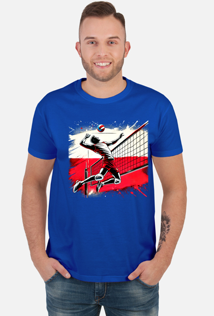 Przedstawiam koszulkę męską z wyjątkową grafiką, która z pewnością przyciągnie uwagę. Na koszulce znajduje się polski siatkarz w dynamicznym skoku nad siatką, na tle stylizowanej flagi Polski. Grafika w stylu pop-art, utrzymana w intensywnych odcieniach czerwieni, czerni i bieli, nadaje całości energii i wyrazistości. Sportowa odzież łączy elementy graffiti i vintage stylu, tworząc niezapomniany i unikalny projekt.