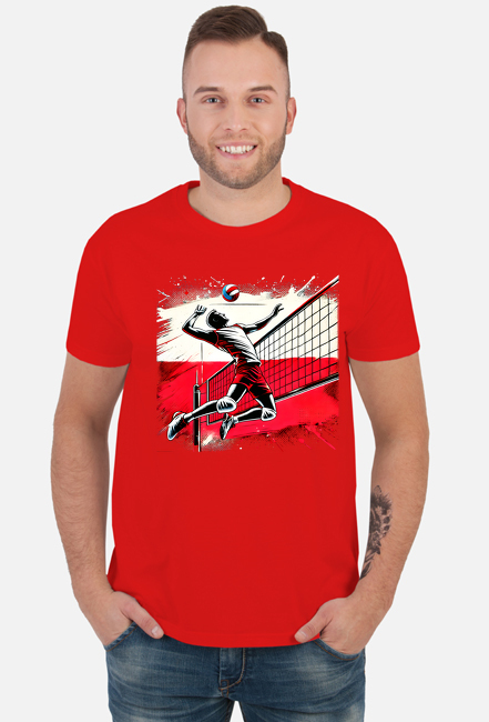 Przedstawiam koszulkę męską z wyjątkową grafiką, która z pewnością przyciągnie uwagę. Na koszulce znajduje się polski siatkarz w dynamicznym skoku nad siatką, na tle stylizowanej flagi Polski. Grafika w stylu pop-art, utrzymana w intensywnych odcieniach czerwieni, czerni i bieli, nadaje całości energii i wyrazistości. Sportowa odzież łączy elementy graffiti i vintage stylu, tworząc niezapomniany i unikalny projekt.