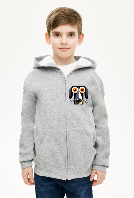 Rozpinana Bluza z Kapturem Dla Chłopca - Czarno-Szary Pies Ilustracja z Dużymi Pomarańczowymi Oczami - Unikalna Grafika Dla Miłośników Zwierząt SKU: ch-opi-ca-bluza-z-kapturem-na-zamek_5q9tmj10_4779434