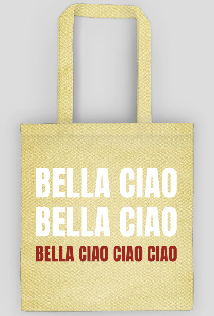 Bella Ciao Bella Ciao Ciao Ciao - torba z nadrukiem. Ciao Bella oznacza "cześć piękan" i powiedzonko to jest znane z pewnej piosenki, która jest ostatnio popularna dzięki hiszpańskiemu serialowi. Torba z nadrukiem Bella Ciao będzie super wyglądać i już z daleka będzie się rzucać w oczy. Polecamy!