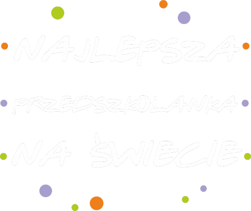 Koszulka z nadrukiem "najlepsza przedszkolanka na świecie" z kolorowymi kuleczkami, a napis jest nadrukowany znaną czcionką, kojarzącą się z serialem "Przyjaciele".