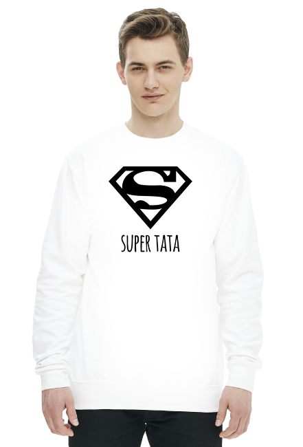 Super Tata - bluza na Dzień Taty. Biała bluza z czarnym nadrukiem na Dzień Ojca. Bluza ze znakiem Supermana i napisem "Super Tata". Przypominamy, że Dzień Ojca świętujemy 23 czerwca, a bluza super taty będzie super prezentem na tę okazję.