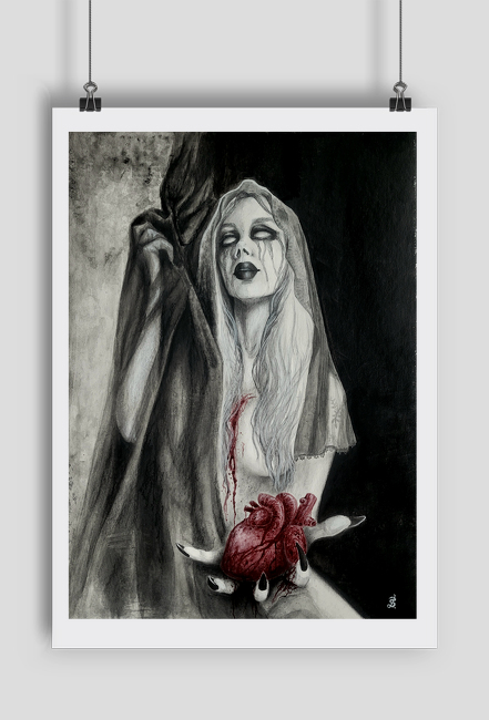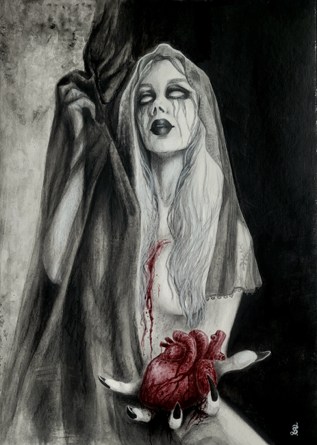 Krwawa Walentynka, gotycka, mroczna dziewczyna zagubiona w prawdziwym romansie. / Ręcznie malowana tuszami, farbami akrylowami, akwarelami oraz gwaszem na tekturze. /
