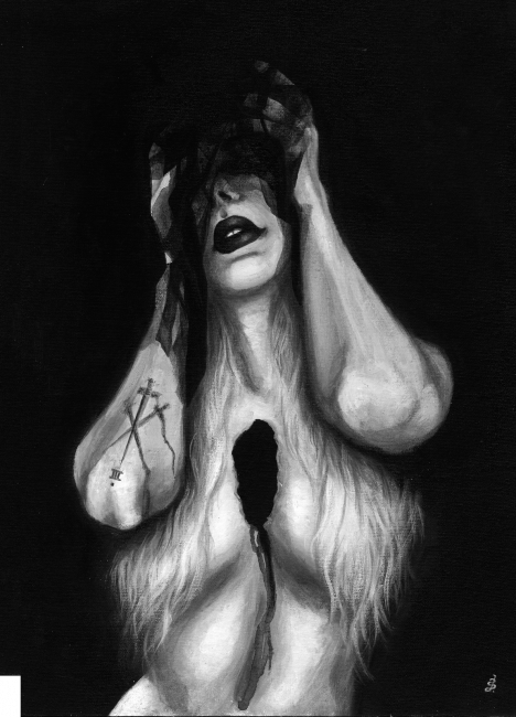 Trójka mieczy zainspirowana jedną z kart Tarota. / Ręcznie malowany obraz farbami akrylowymi na płycie pilśniowej. /