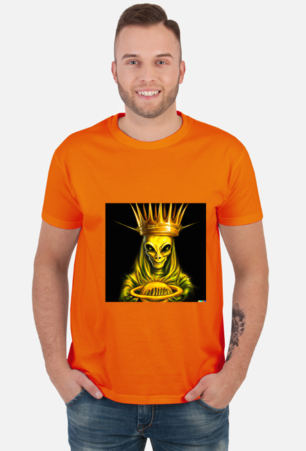 Obrazek przedstawia wygenerowaną postać kosmity w koronie. Obraz powstał przy użyciu Dall-e