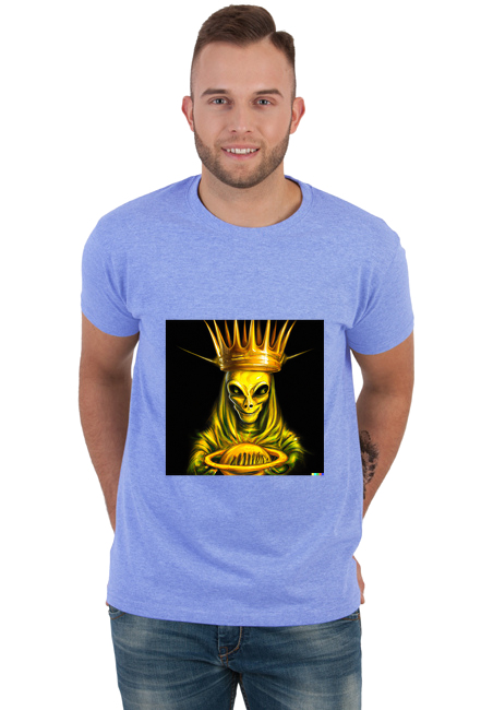 Obrazek przedstawia wygenerowaną postać kosmity w koronie. Obraz powstał przy użyciu Dall-e