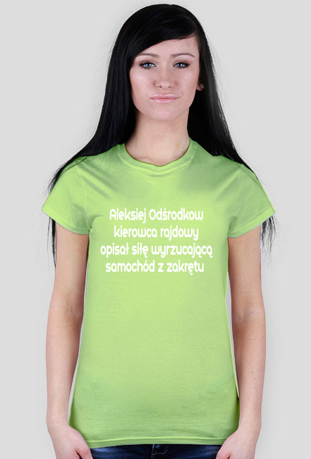 Koszulka damska Aleksiej Odśrodkow przypomina nam o rosyjskim kierowcy rajdowym. Występował on w małych lokalnych rajdach. Drzwi do wielkiej kariery zamknęła mu kontuzja, którą odniósł po tym, jak przy wchodzeniu w ostry zakręt jego samochód przechylił się na bok, a następnie dachował. Zmuszony do zakończenia kariery Odśrodkow postanowił zająć się fizyką i zbadać nieznaną siłę, która zadziałała na jego samochód. Objawia się ona także znacznie łagodniej, kiedy przechyla nas w stronę przeciwną do tej, w którą akurat skręcamy. Dzięki jego badaniom kierowcy mogli poprawić technikę jazdy i częściej udawało im się uniknąć podobnych wypadków w przyszłości, a wzorem wielkich fizyków z minionych wieków siłę tę nazwano nazwiskiem badacza.