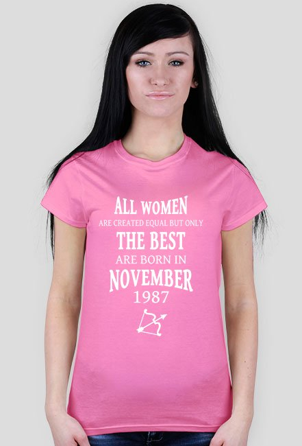 Wyróżnij się! Napis "ALL WOMEN ARE CREATED EQUAL BUT ONLY THE BEST ARE BORN IN NOVEMBER 1987". Idealny prezent na każdą okazje dla wszystkich urodzonych w listopadzie i to nie ważne czy: dzień mamy, babci, siostry, córki, synowej, imieniny, urodziny, bądź walentynki. Znak zodiaku - strzelec. W końcu każda kobieta jest wyjątkowa! Wyraź to za pomocą tego napisu... i noś z dumą! :)