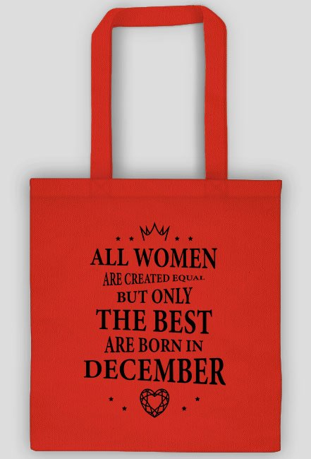Wyróżnij się! Napis "ALL WOMEN ARE CREATED EQUAL BUT ONLY THE BEST ARE BORN IN DECEMBER". Idealny prezent na każdą okazje dla wszystkich urodzonych w grudniu i to nie ważne czy: dzień mamy, babci, siostry, córki, synowej, imieniny, urodziny, bądź walentynki. W końcu każda kobieta jest wyjątkowa! Wyraź to za pomocą tego napisu... i noś z dumą! :)