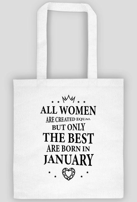Wyróżnij się! Napis "ALL WOMEN ARE CREATED EQUAL BUT ONLY THE BEST ARE BORN IN JANUARY". Idealny prezent na każdą okazje dla wszystkich urodzonych w styczniu i to nie ważne czy: dzień mamy, babci, siostry, córki, synowej, imieniny, urodziny, bądź walentynki. W końcu każda kobieta jest wyjątkowa! Wyraź to za pomocą tego napisu... i noś z dumą! :)