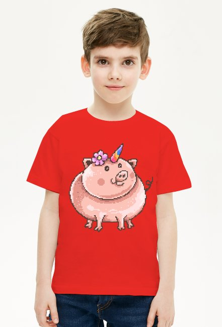 Koszulka z nadrukiem stylizowanym na 8bitowej grafice przedstawiającej świnkę jednorożca. Świetna na prezent dla kogoś bliskiego ;)