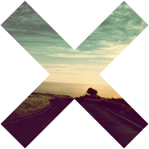 X wypełniony zdjęciem nieznanej drogi prowadzącej w stronę zachodu słońca.