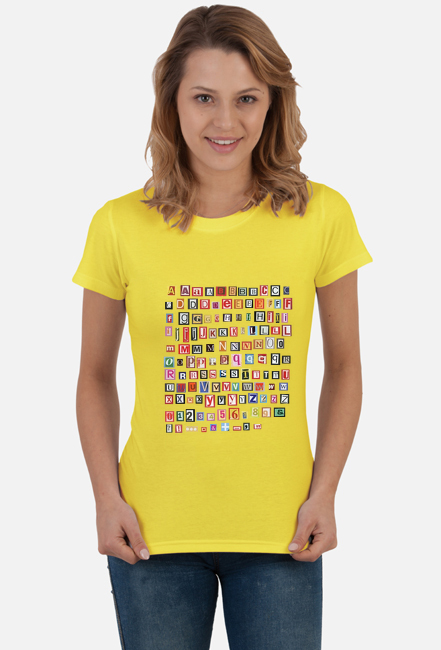 Alfabet wycinany. Koszulka damska z alfabetem dla miłośników książek.