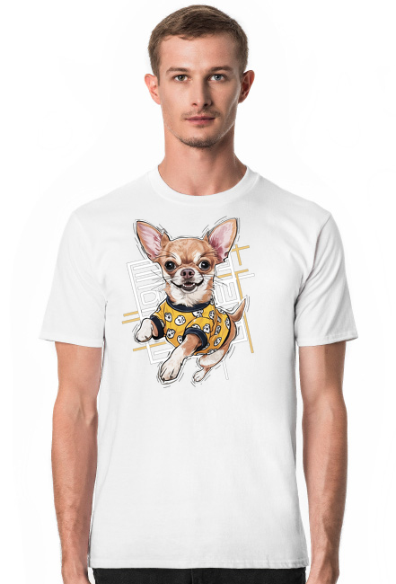 - Na przedniej części koszulki znajduje się uroczy rysunek chihuahua, który jest ubrany w kolorową, wakacyjną koszulkę. Piesek jest przedstawiony w radosnej pozie z szerokim, zaraźliwym uśmiechem, który od razu poprawia humor