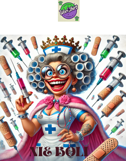 Uwaga, oto **MUST HAVE** każdej pielęgniarki z poczuciem humoru! Nasza koszulka przedstawia pielęgniarkę w pełnej królewskiej odsłonie – z koroną z plastrów i berłem ze strzykawki. Z takim strojem nikt nie ma wątpliwości, kto tu rządzi! A na deser? Zabawny napis **„Nie boli”**, który rozładuje każdą nerwową atmosferę i doda pacjentom odwagi... nawet, gdy wiedzą, że zaraz będzie zastrzyk!