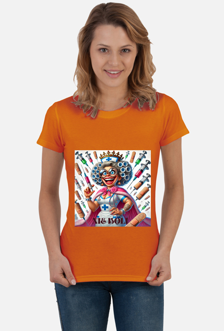 Uwaga, oto **MUST HAVE** każdej pielęgniarki z poczuciem humoru! Nasza koszulka przedstawia pielęgniarkę w pełnej królewskiej odsłonie – z koroną z plastrów i berłem ze strzykawki. Z takim strojem nikt nie ma wątpliwości, kto tu rządzi! A na deser? Zabawny napis **„Nie boli”**, który rozładuje każdą nerwową atmosferę i doda pacjentom odwagi... nawet, gdy wiedzą, że zaraz będzie zastrzyk!