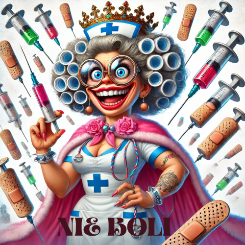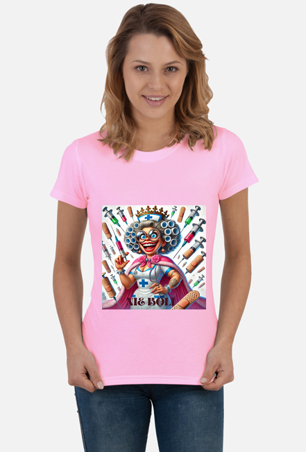 Uwaga, oto **MUST HAVE** każdej pielęgniarki z poczuciem humoru! Nasza koszulka przedstawia pielęgniarkę w pełnej królewskiej odsłonie – z koroną z plastrów i berłem ze strzykawki. Z takim strojem nikt nie ma wątpliwości, kto tu rządzi! A na deser? Zabawny napis **„Nie boli”**, który rozładuje każdą nerwową atmosferę i doda pacjentom odwagi... nawet, gdy wiedzą, że zaraz będzie zastrzyk!