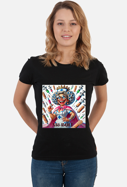 Uwaga, oto **MUST HAVE** każdej pielęgniarki z poczuciem humoru! Nasza koszulka przedstawia pielęgniarkę w pełnej królewskiej odsłonie – z koroną z plastrów i berłem ze strzykawki. Z takim strojem nikt nie ma wątpliwości, kto tu rządzi! A na deser? Zabawny napis **„Nie boli”**, który rozładuje każdą nerwową atmosferę i doda pacjentom odwagi... nawet, gdy wiedzą, że zaraz będzie zastrzyk!