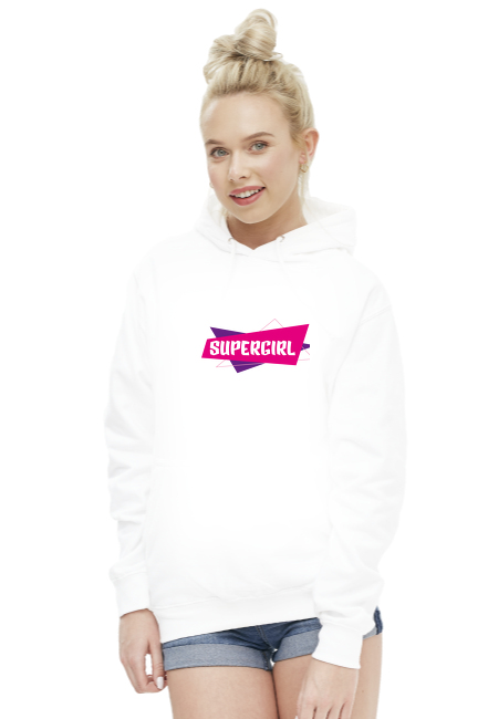 Damska bluza z kapturem z napisem SUPERGIRL. Doskonały pomysł na prezent z okazji Dnia Kobiet dla dziewczyny, przyjaciółki, mamy i każdej super babeczki!